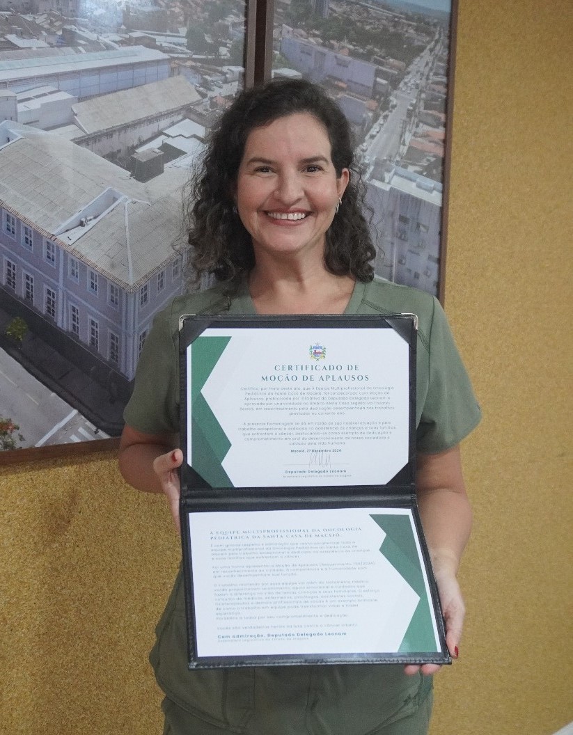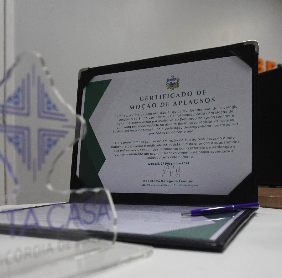 A Santa Casa de Maceió recebeu uma Moção de Aplausos da Assembleia Legislativa de Alagoas, aprovada por unanimidade. A iniciativa partiu do Deputado Delegado Leonam, seguindo o Requerimento nº 759/2024, e é destinada à Equipe Multiprofissional da Oncologia Pediátrica do complexo hospitalar.