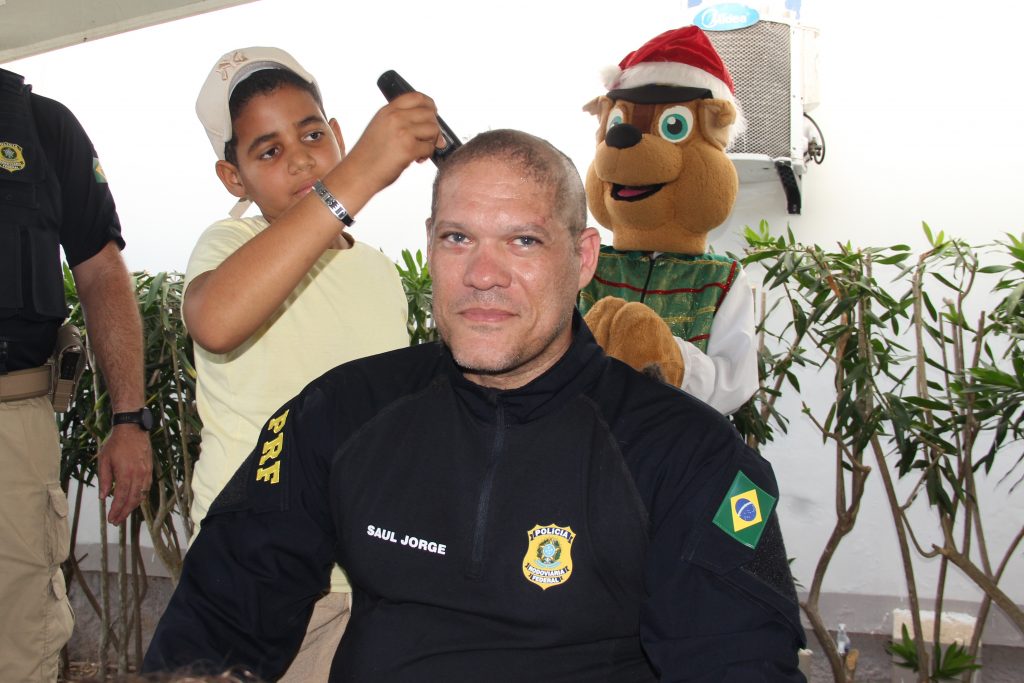 Além das atividades lúdicas, alguns policiais decidiram raspar a cabeça como gesto de apoio às crianças que perdem os fios durante a quimioterapia.
