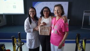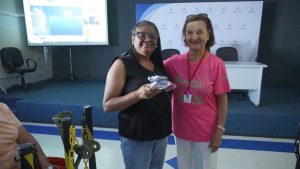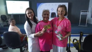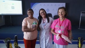 Kelly Costa, psicóloga e Aidê Soares, representante da Rede Feminina com a participante no momento da entrega de brindes