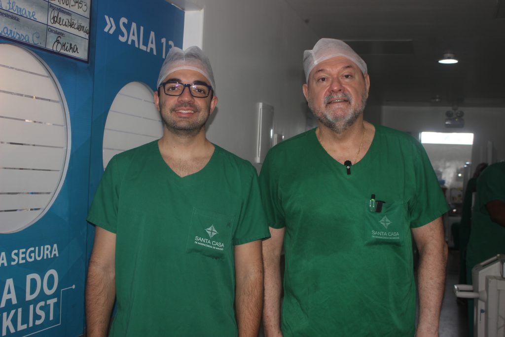 O proctologista Luiz Salvador e o cirurgião do aparelho digestivo Ricardo Tavares no centro cirúrgico da Santa Casa de Maceió